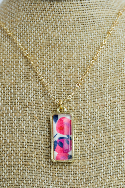 Necklaces and earrings featuring Liberty of London fabric and gold plated bezel designs for a more formal accessory presentation.