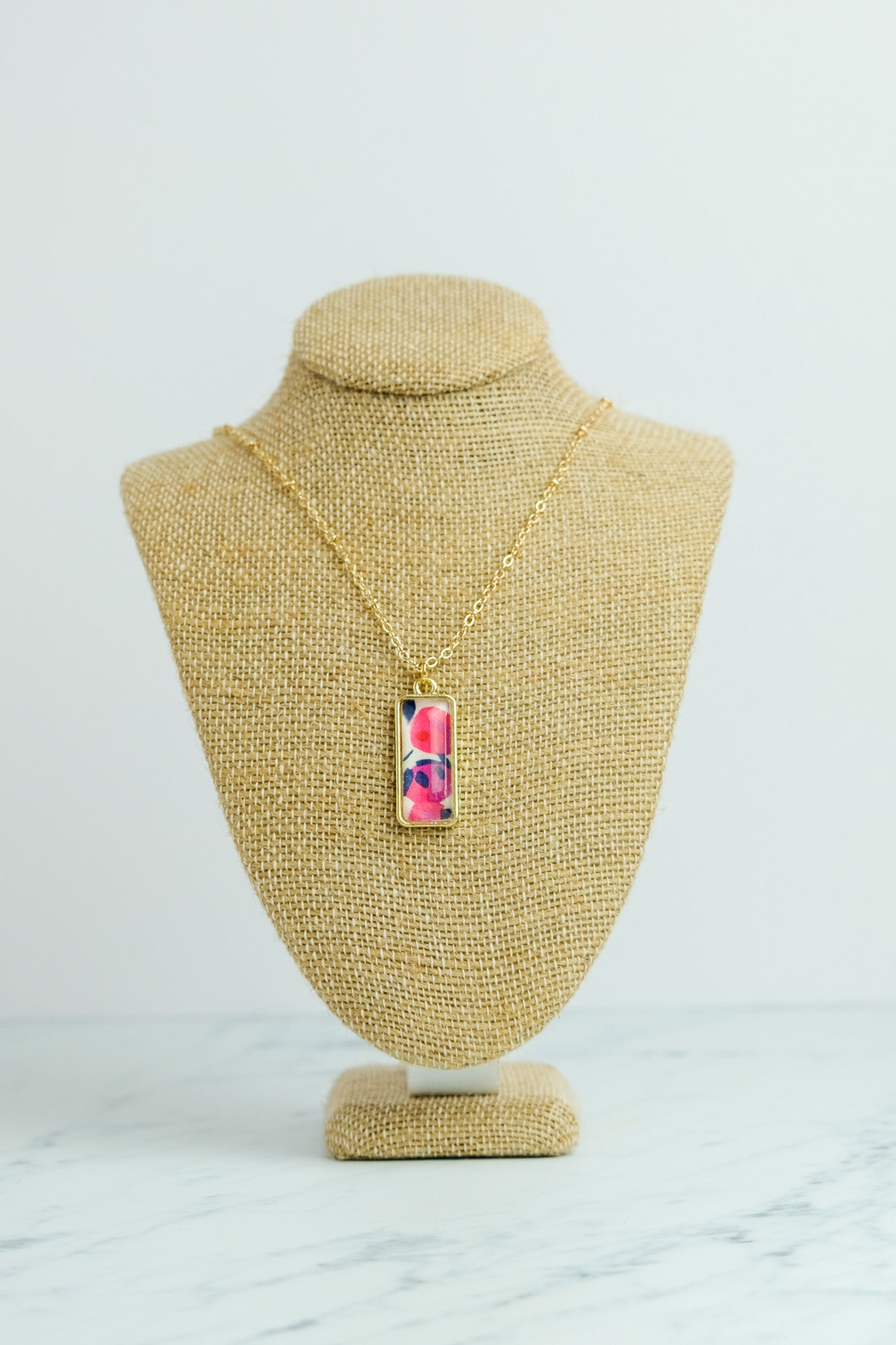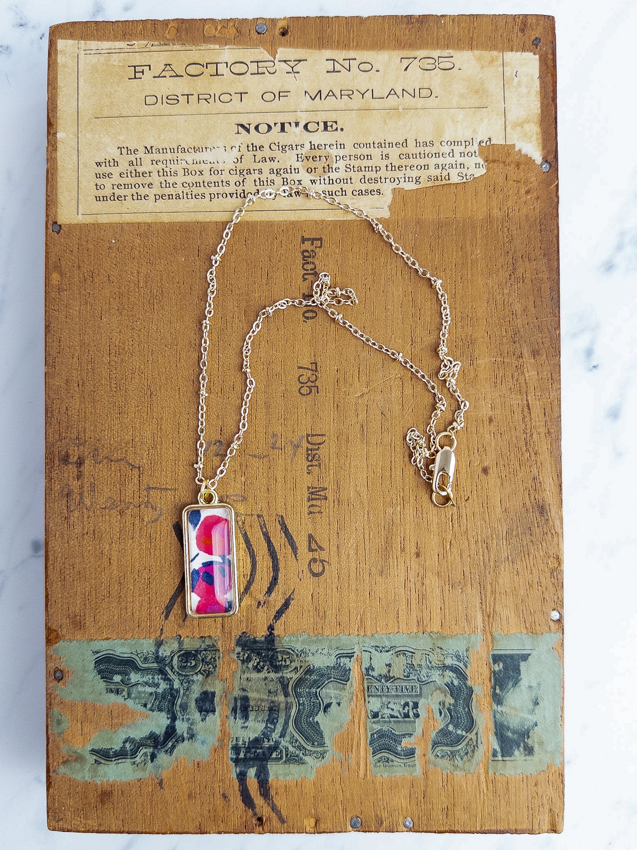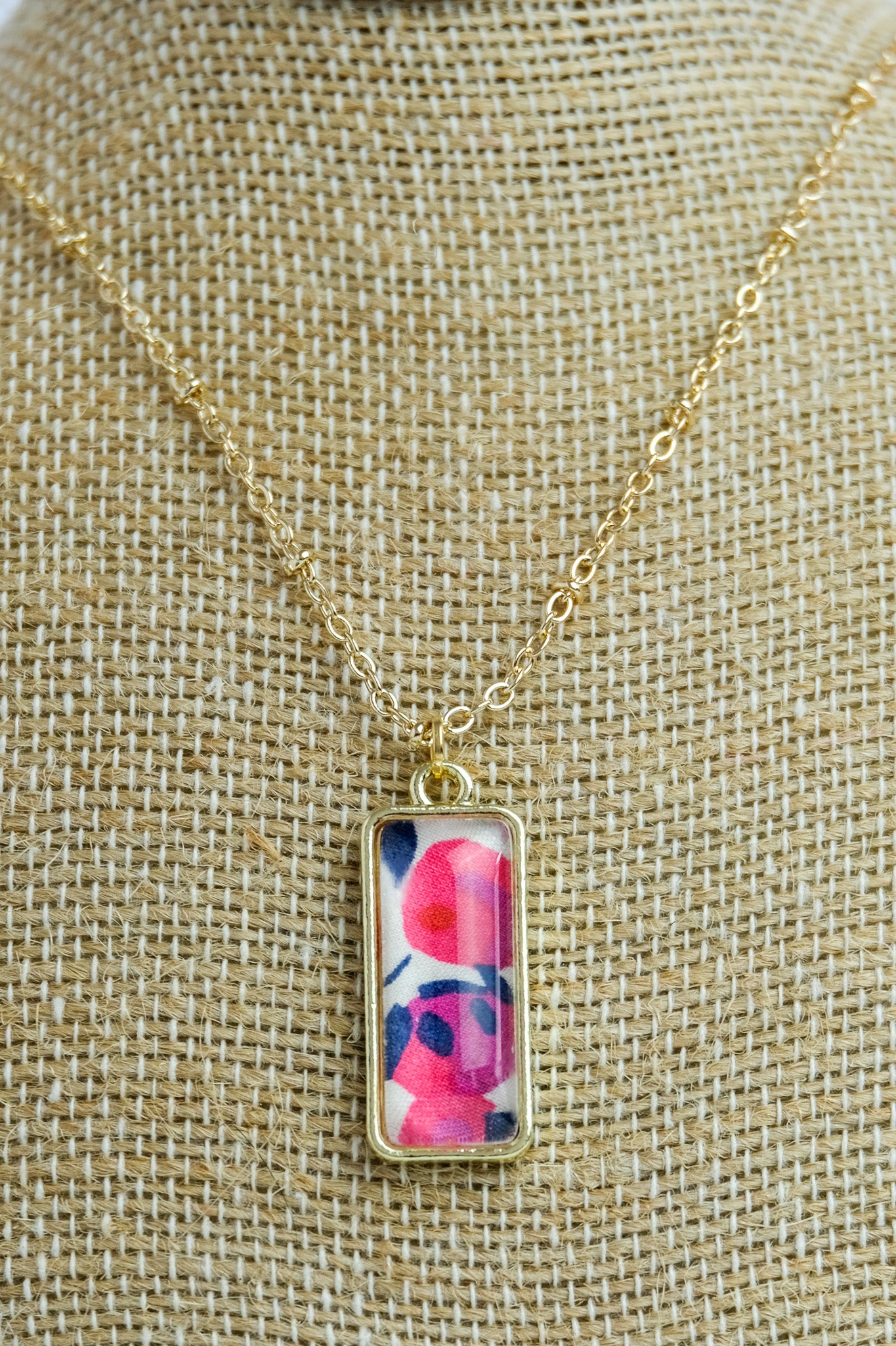 A delicate 16" 14 karat gold-plated satellite chain with a 1" x 1/2" gold finish rectangle bezel, showing off a floral Liberty of London fabric print in the Wiltshire Berry pattern. Clasps and findings are 14k gold plate or filled. Bezel is lead and nickel safe.