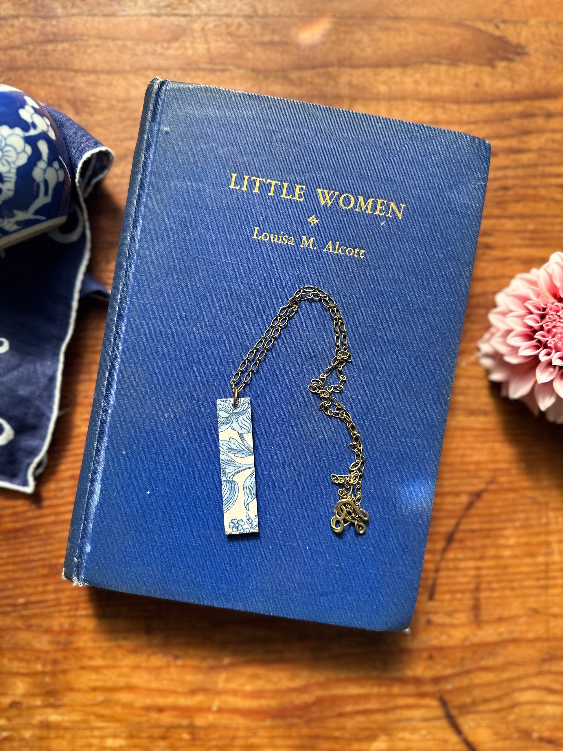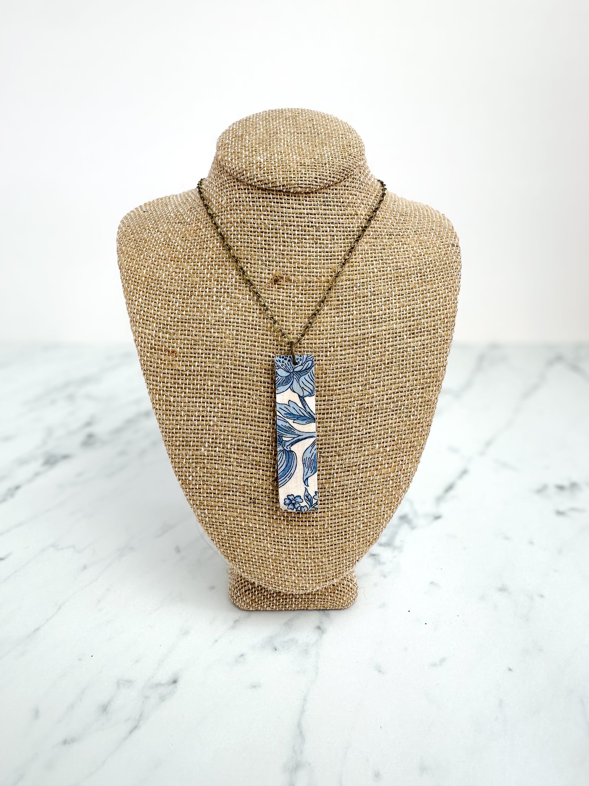 2" x 1/2" Birch wood pendant in landscape style with Liberty of London blue and white floral fabric, inspired by Chinoiserie decorative arts. The chain and findings are antiqued brass.